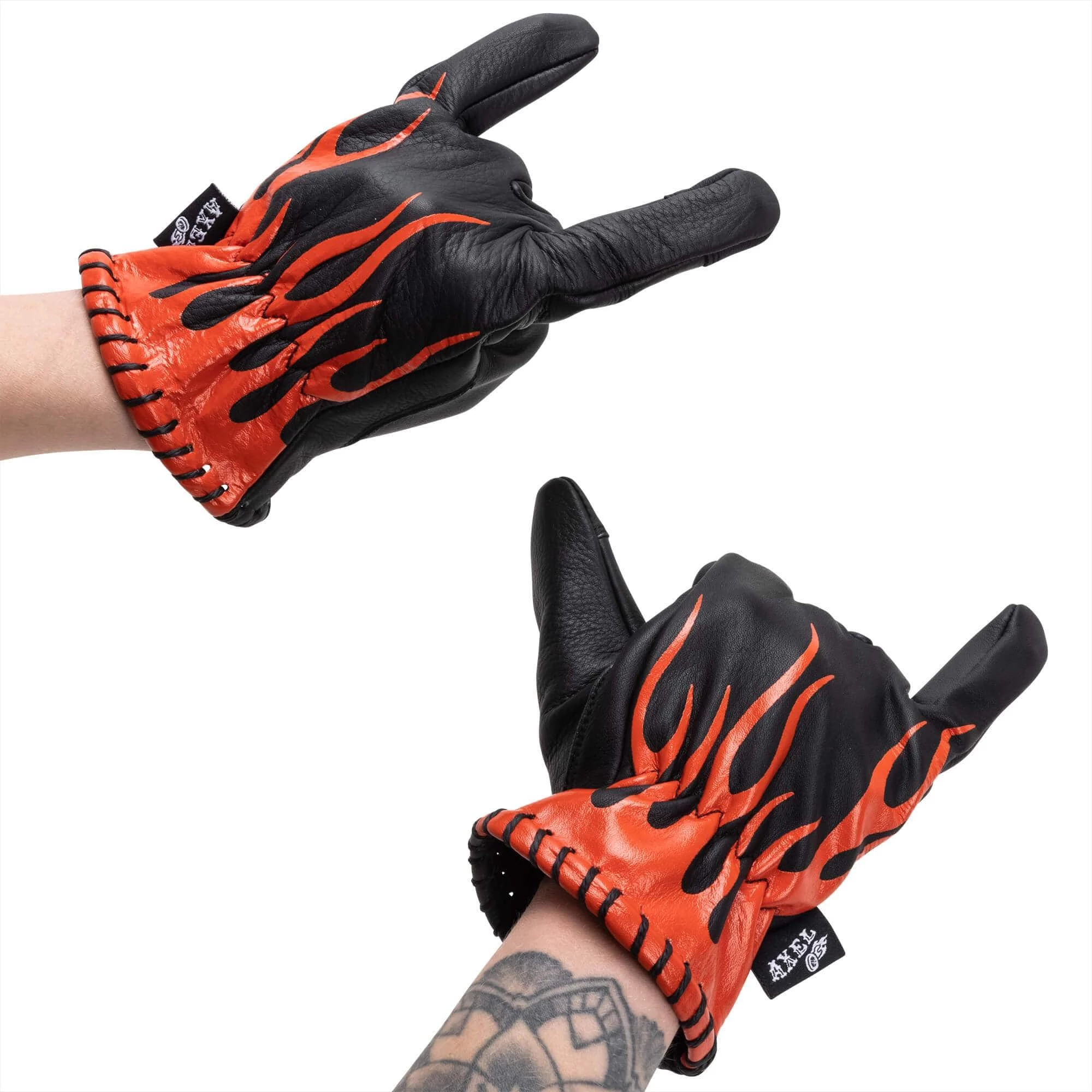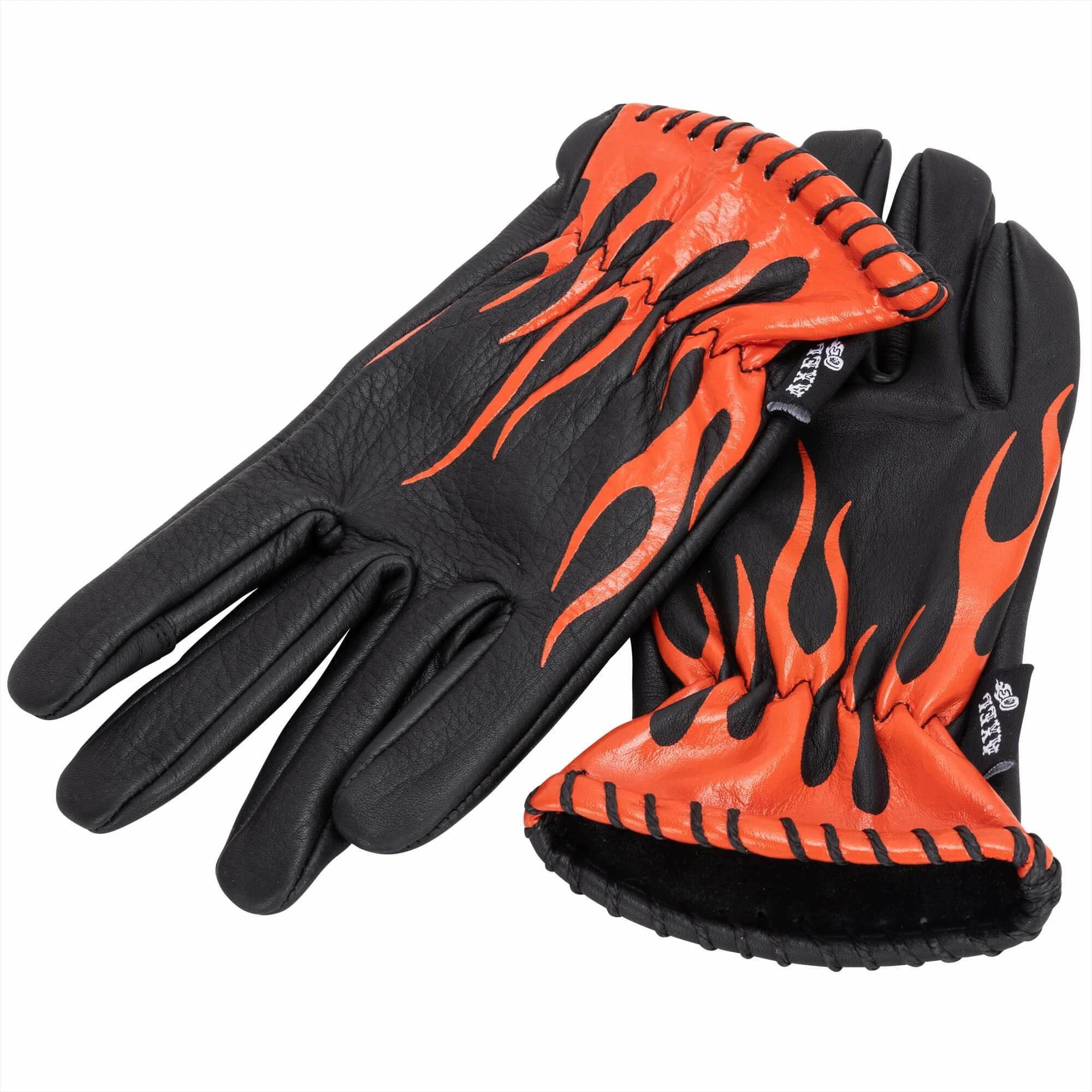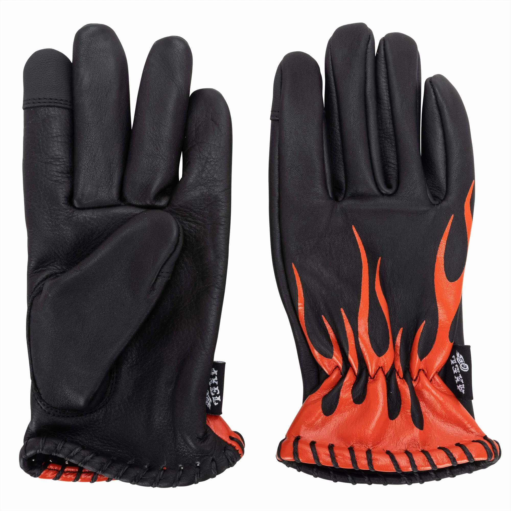 These heavy duty leather gloves from Axel Co. are made from high quality 100% black cow hide and feature orange flames. They are touch screen compatible with pointer and thumb finger touch screen sensors, and feature stitched wrists.