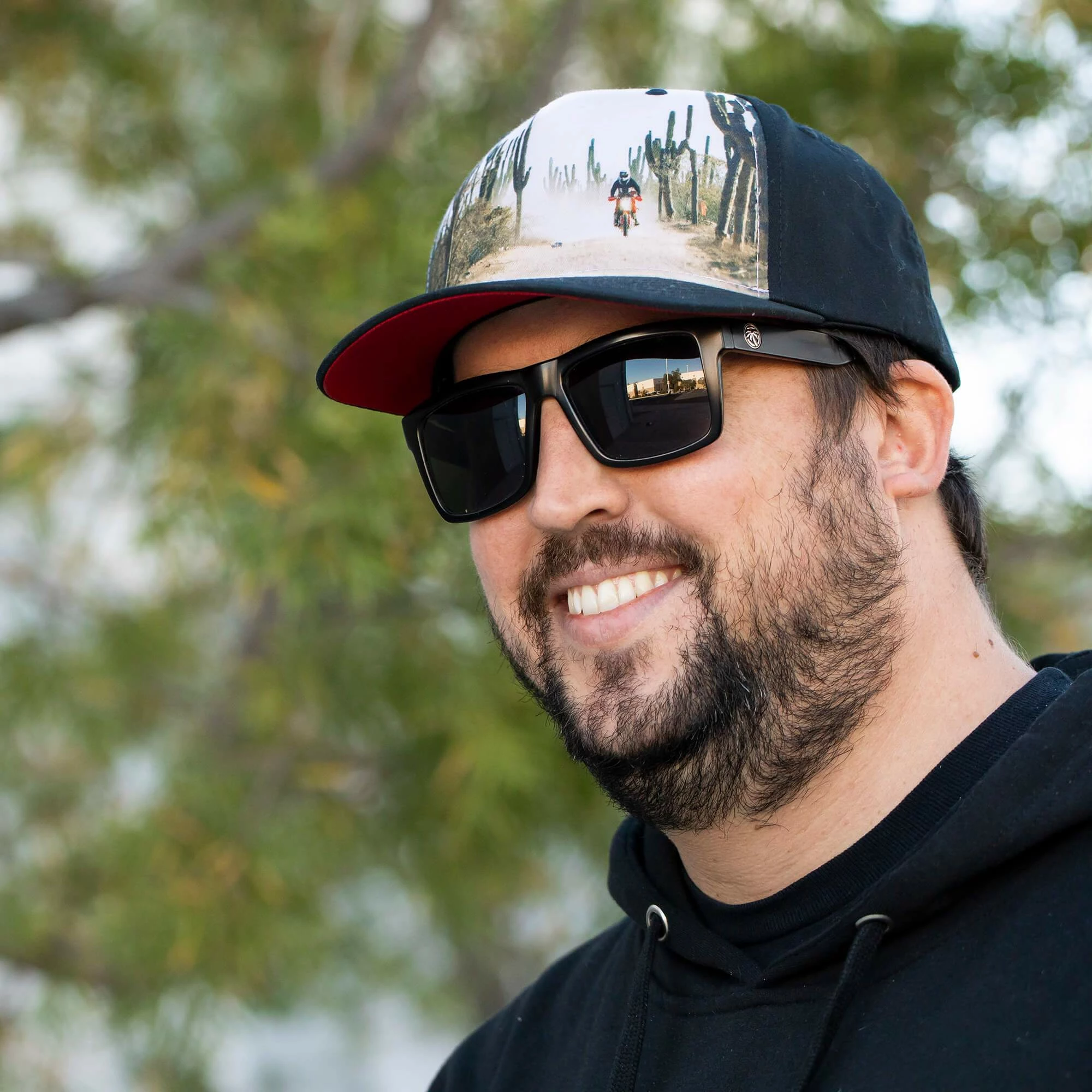 This full cotton twill snapback trucker features one of our favorite Geoff Kowalchuk photos from the NORRA 1000 printed edge-to-edge on the front panels. (Rider: Chris Moeller) Details include contrast color under the pre-curved bill and woven tag on back for authenticity.