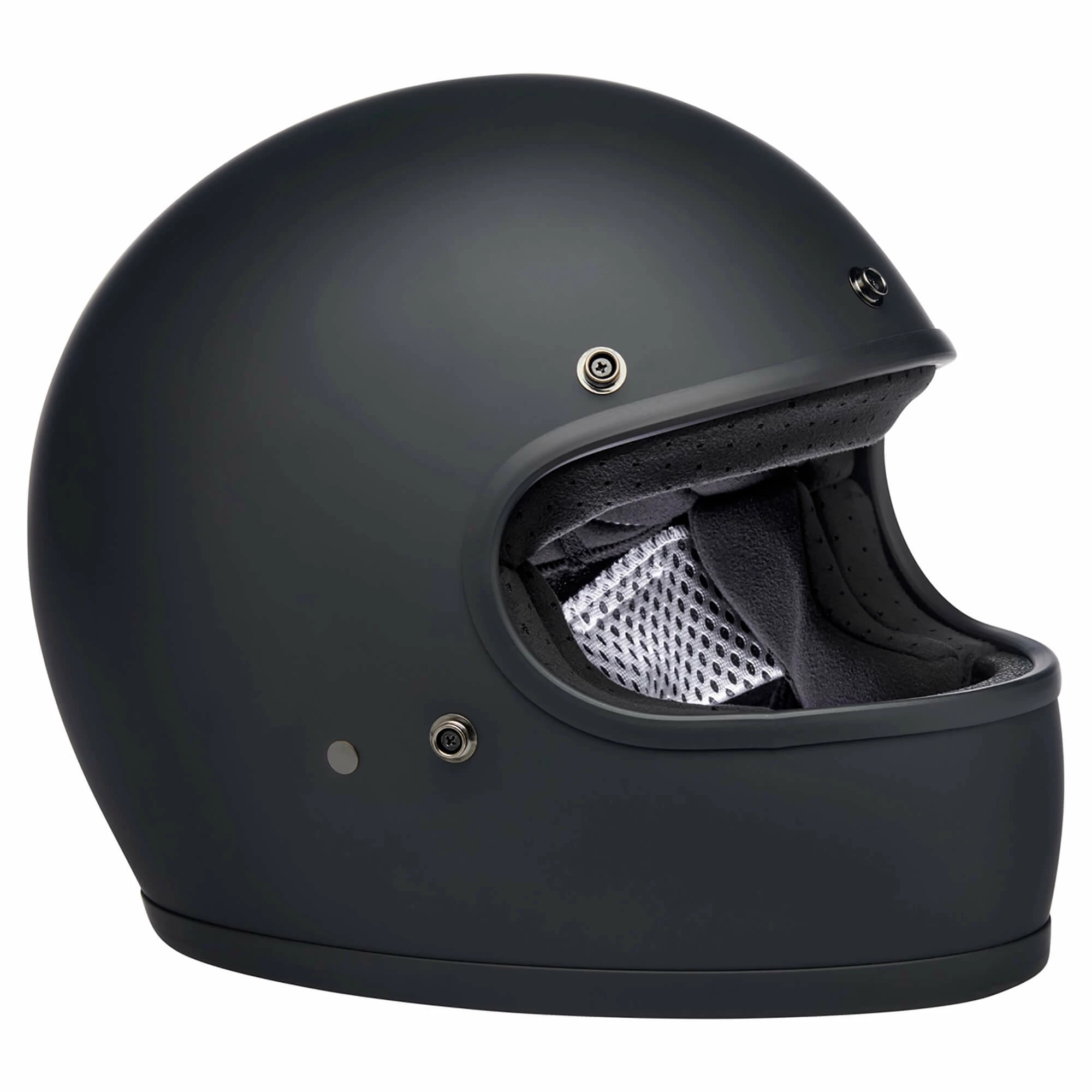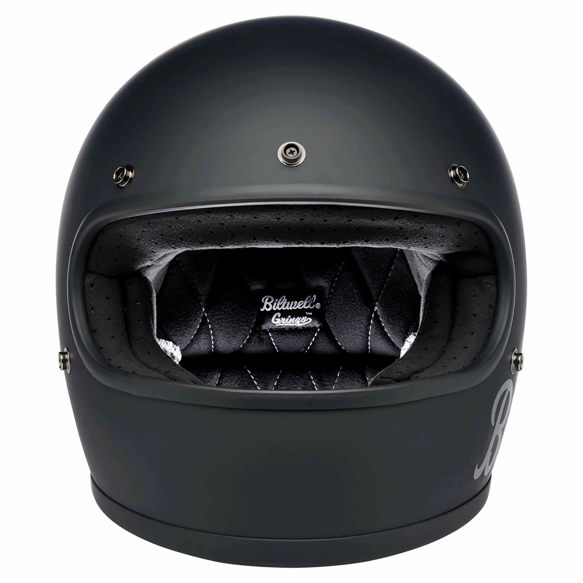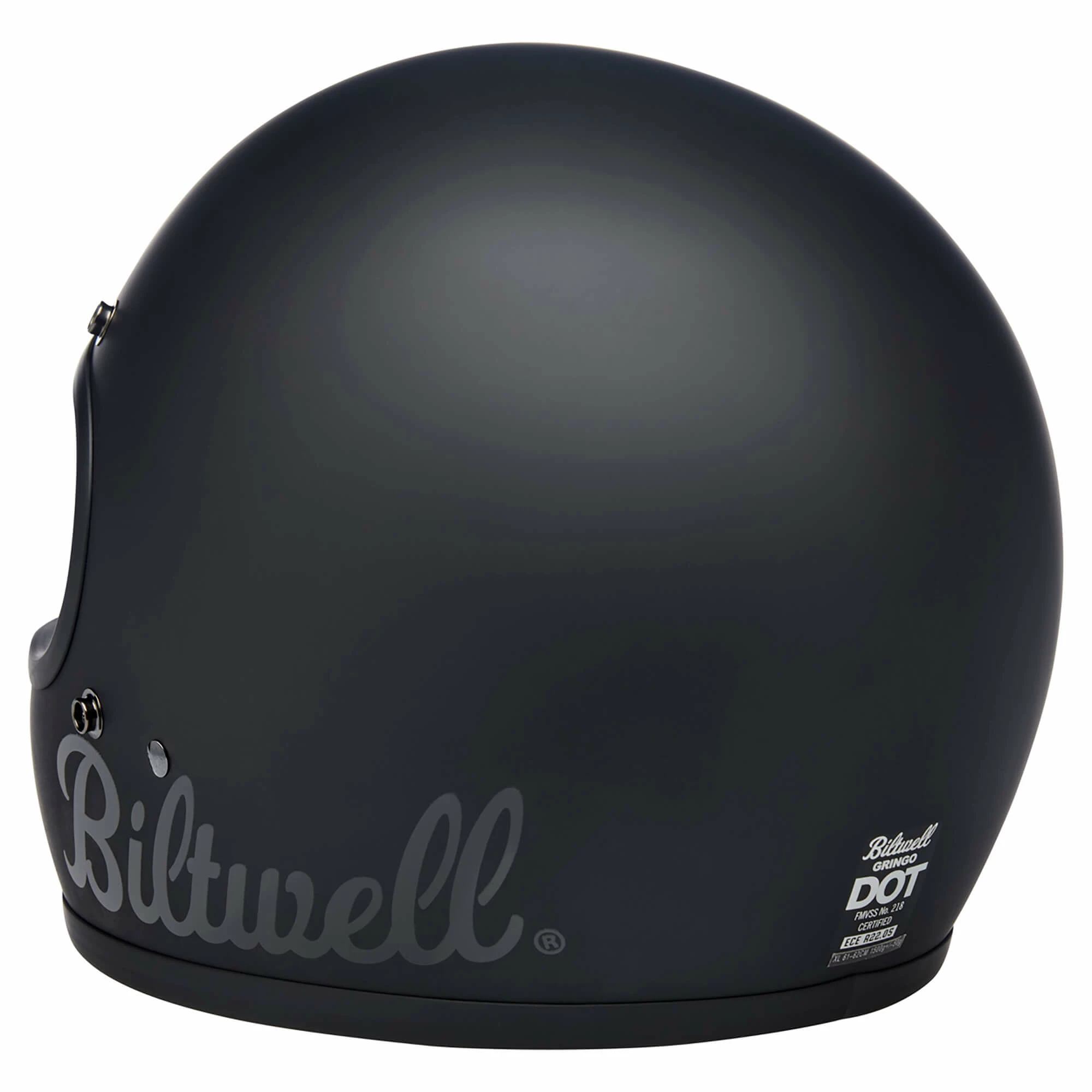 Construction: Seamless injection-molded ABS outer shell, shock-absorbing EPS inner shell and a removable, hand-stitched removable comfort liner with open-cell foam and brushed Lycra construction. The chinstrap is adorned with brushed Lycra material on touch points and features a flat D-ring fastener with an adjustable snap end retainer. Five snaps around the Gringo’s eye port facilitate easy installation of a Biltwell bubble shield or Blast shield (sold separately.)