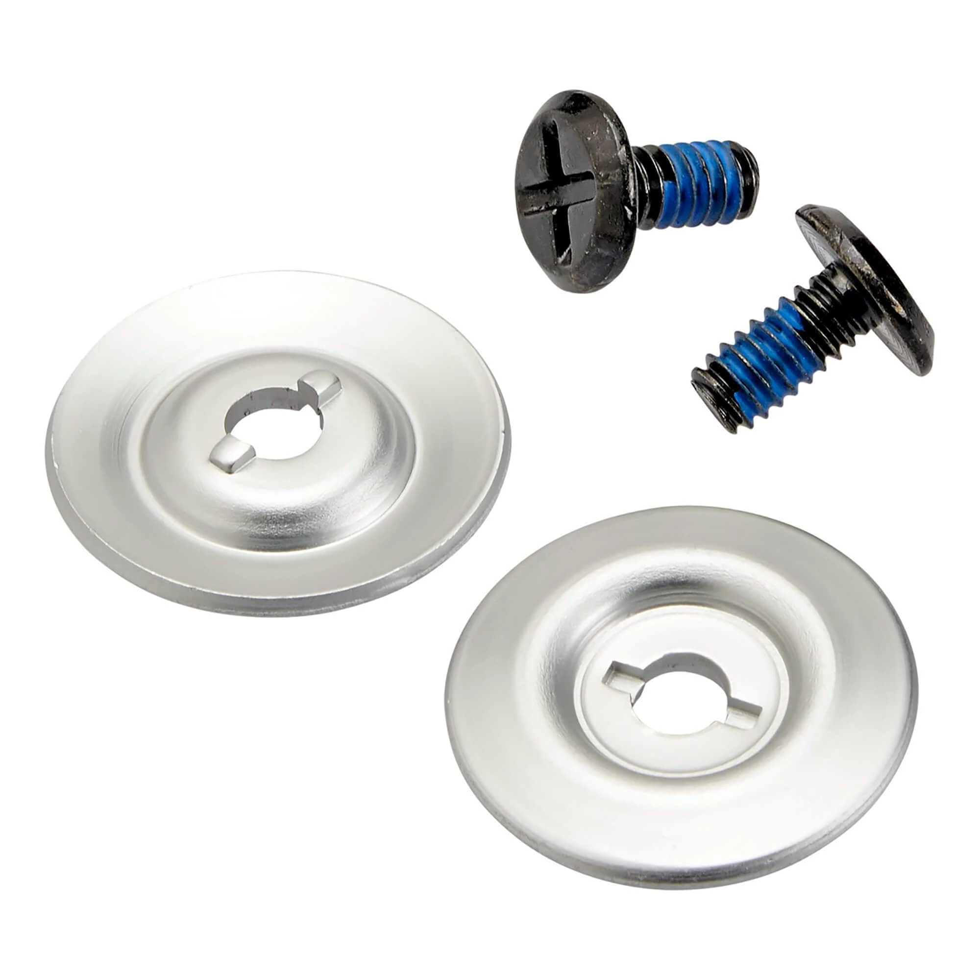 Apply one drop of medium-strength blue Loc-Tite on the threads of each screw during installation. Align the index bumps on the back side of the washers with their corresponding slots on the plastic hinge spacer behind the shield; hold the washer carefully in position while you tighten the screw. A coin or short straight-slot screwdriver works great for this. DO NOT OVERTIGHTEN.