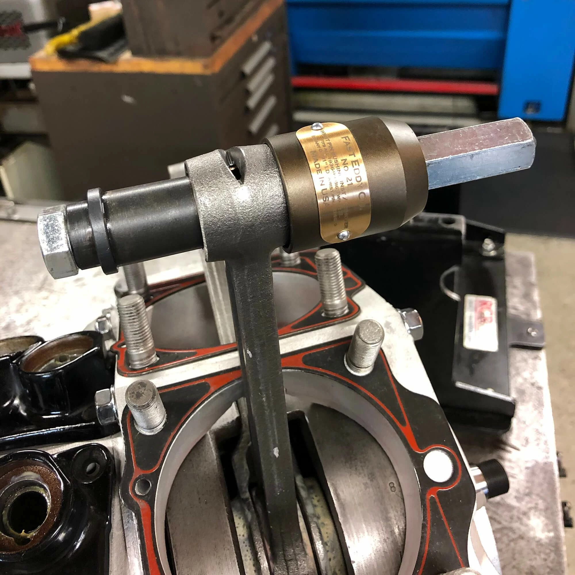 When doing a top end rebuild, it’s important to inspect the wrist pin bushings in the rods and replace them if they’re worn. This tool allows for quick and easy removal of old bushings and installation of new ones. Engineered to work, engineered to last. And as always, this tool is 100% American made. Fast Eddy Co. offers a lifetime warranty to original purchaser.