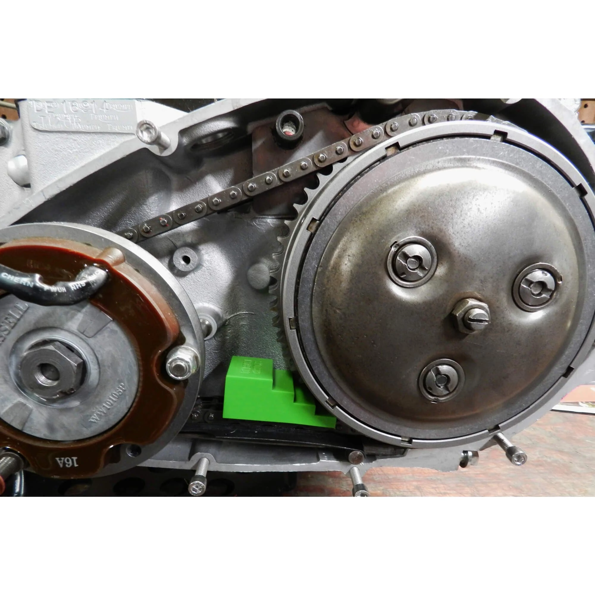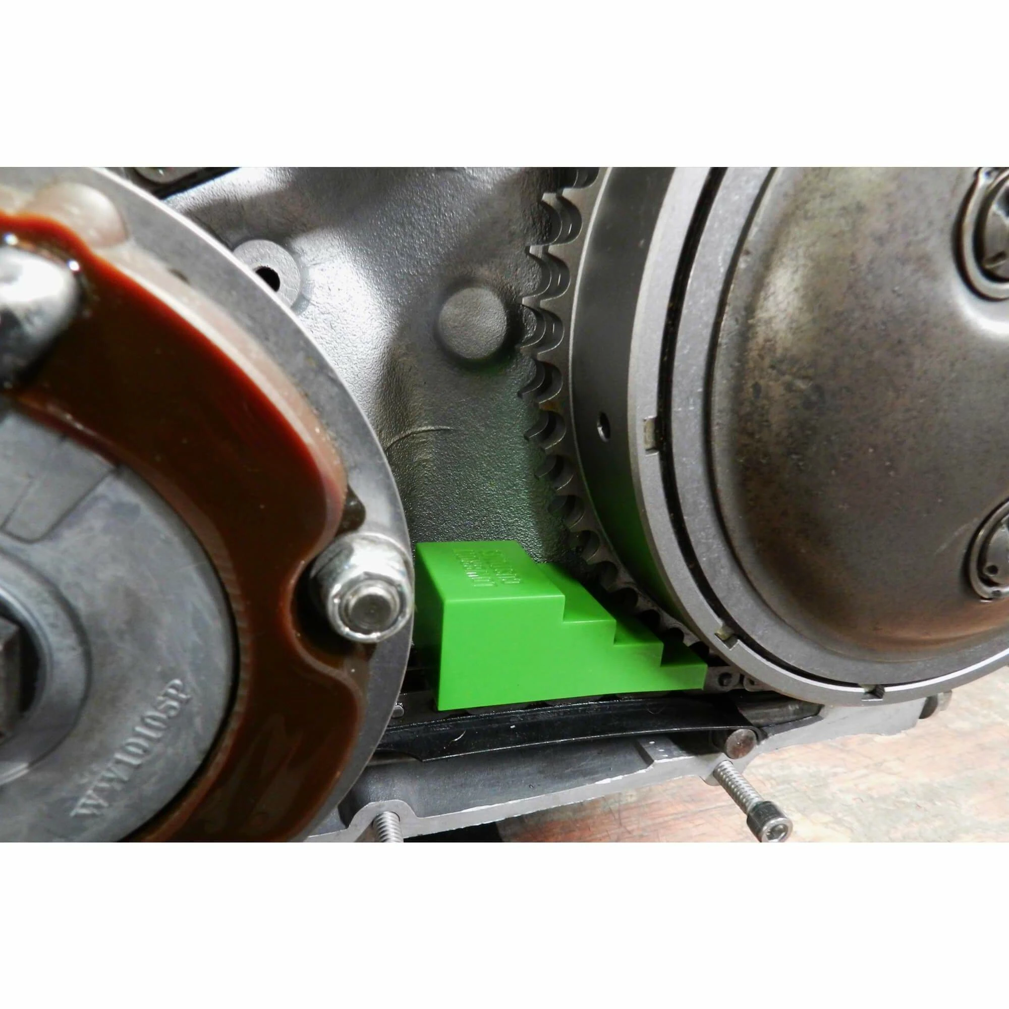 If you are working on the primary or clutch on your Harley-Davidson, Triumph, BSA, Norton, Honda, Yamaha or anything else, this tool will save you a lot of headaches! This grade 95A, high tensile polyurethane locking block can be inserted between your chain and sprocket or clutch basket, locking it in place while you install or remove primary or clutch components. This material is tough enough to take the pressure and stop your primary from turning while you torque hardware in place, but soft enough to not damage your chain, sprocket or pulley. Works well with chains as well as belt drive systems. The bright green helps ensure that you don’t leave it in your primary before you install your primary cover and hit the road! Made in the USA.