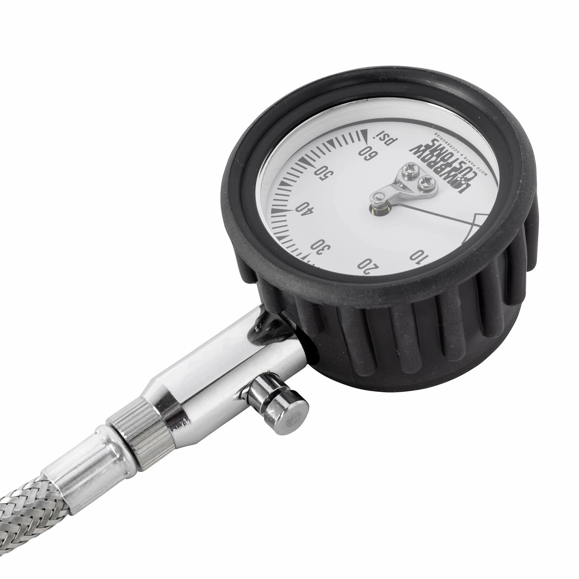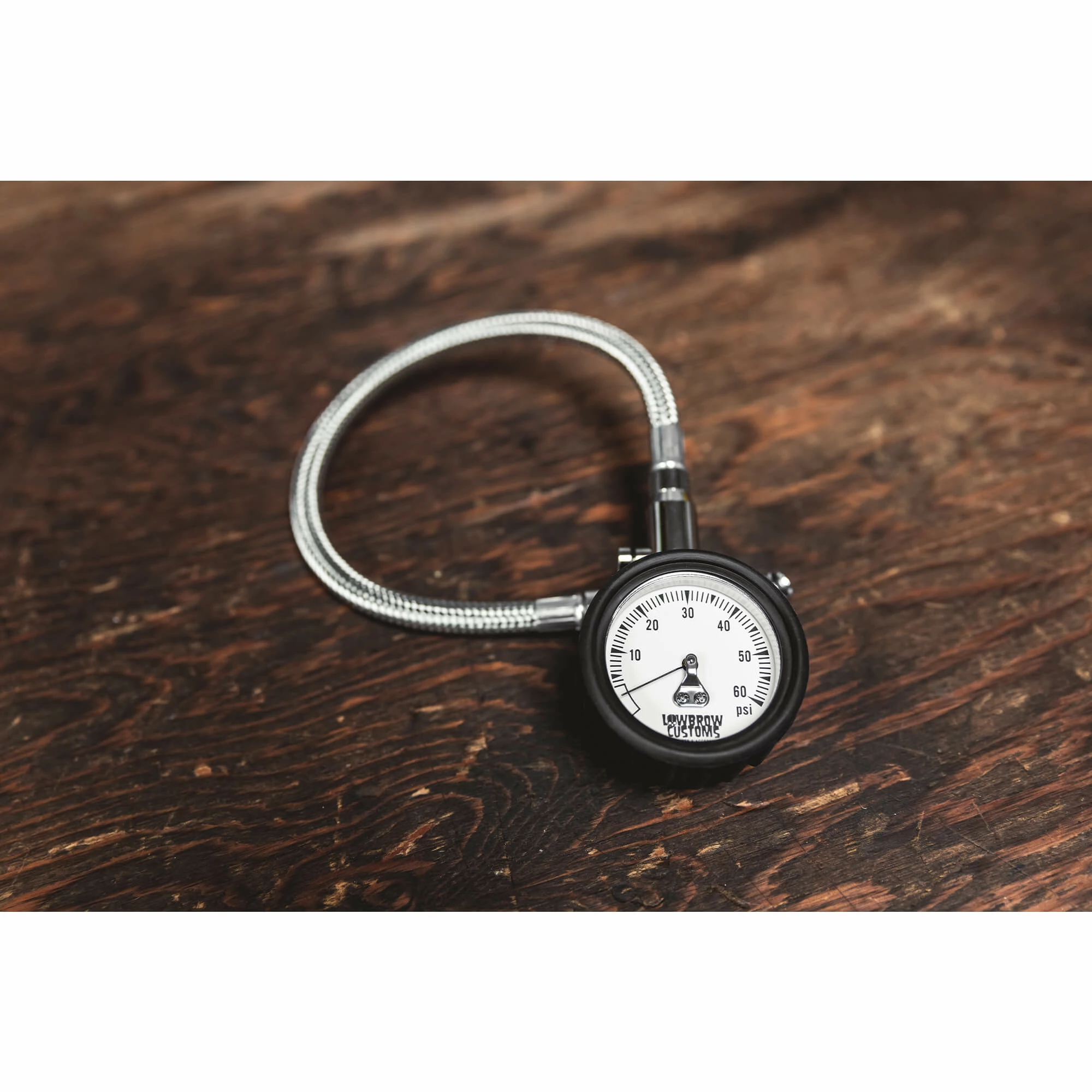 The Lowbrow Customs Tire Gauge has a 2″ gauge face, a 12” stainless-steel braided hose, and a steel body. The 45° angle chuck swivels and will help you get into those tight spots and the rubber casing will help protect the gauge from impact damage. This 0-60 PSI tire pressure gauge also features a push button pressure release valve which makes checking and filling your tires quick and easy.