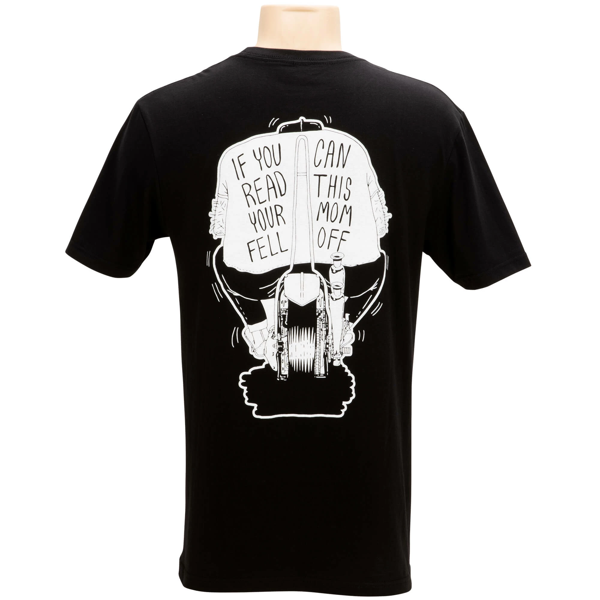 Your Mom Fell Off T-Shirt. Full back imprint, with a left chest logo. Premium, soft, 100% cotton black t-shirt for that vintage look and feel.