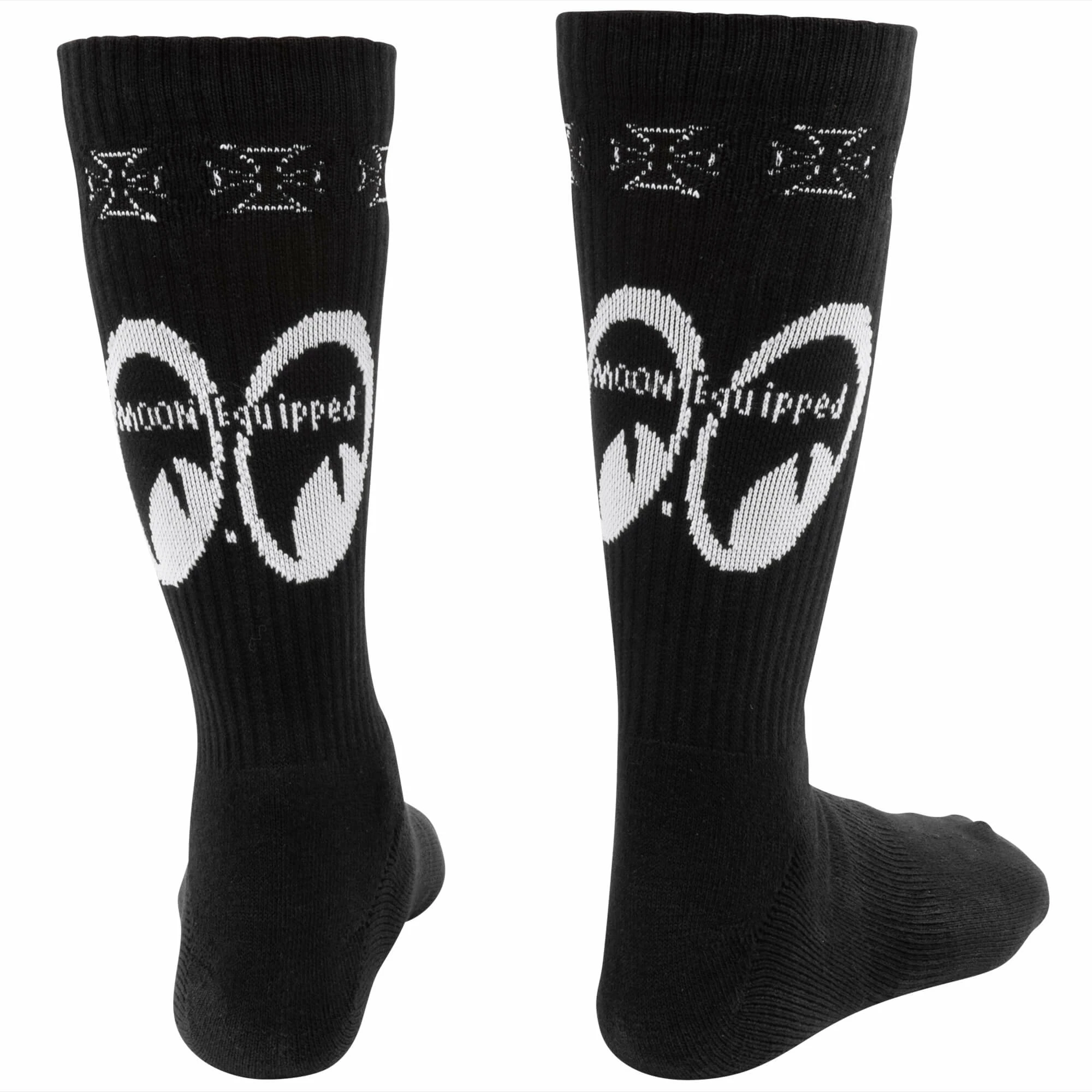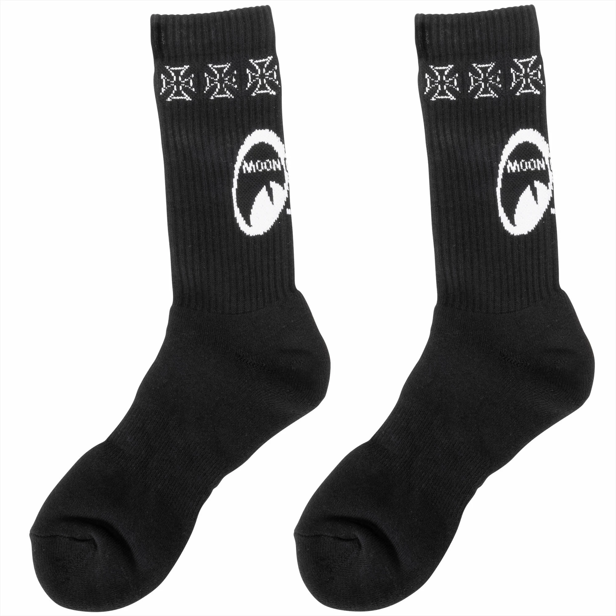 These crew socks feature the MOON Equipped logo and iron cross logos around the calf. Available in White or Black. Keep yourself MOON Equipped, from the bottom up.