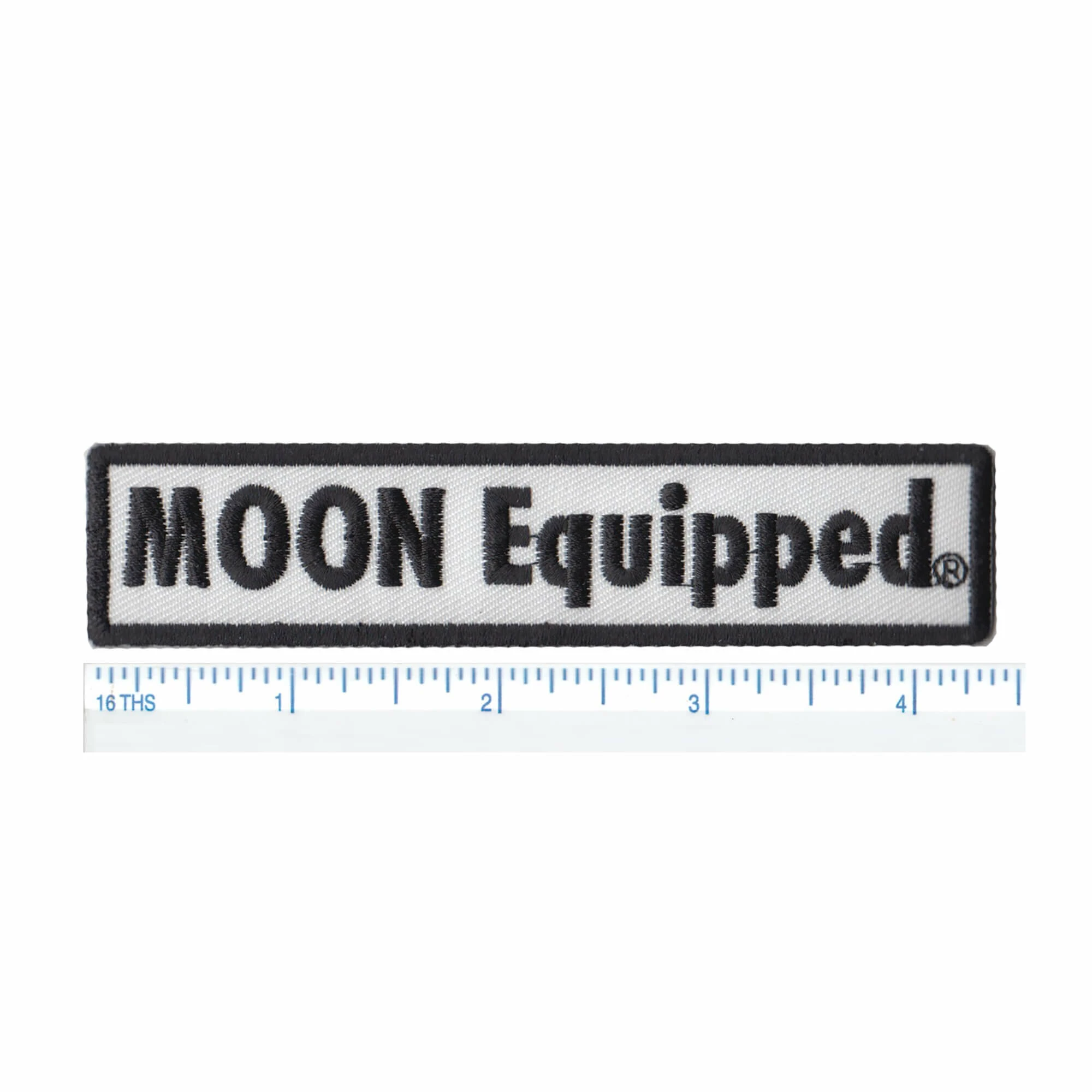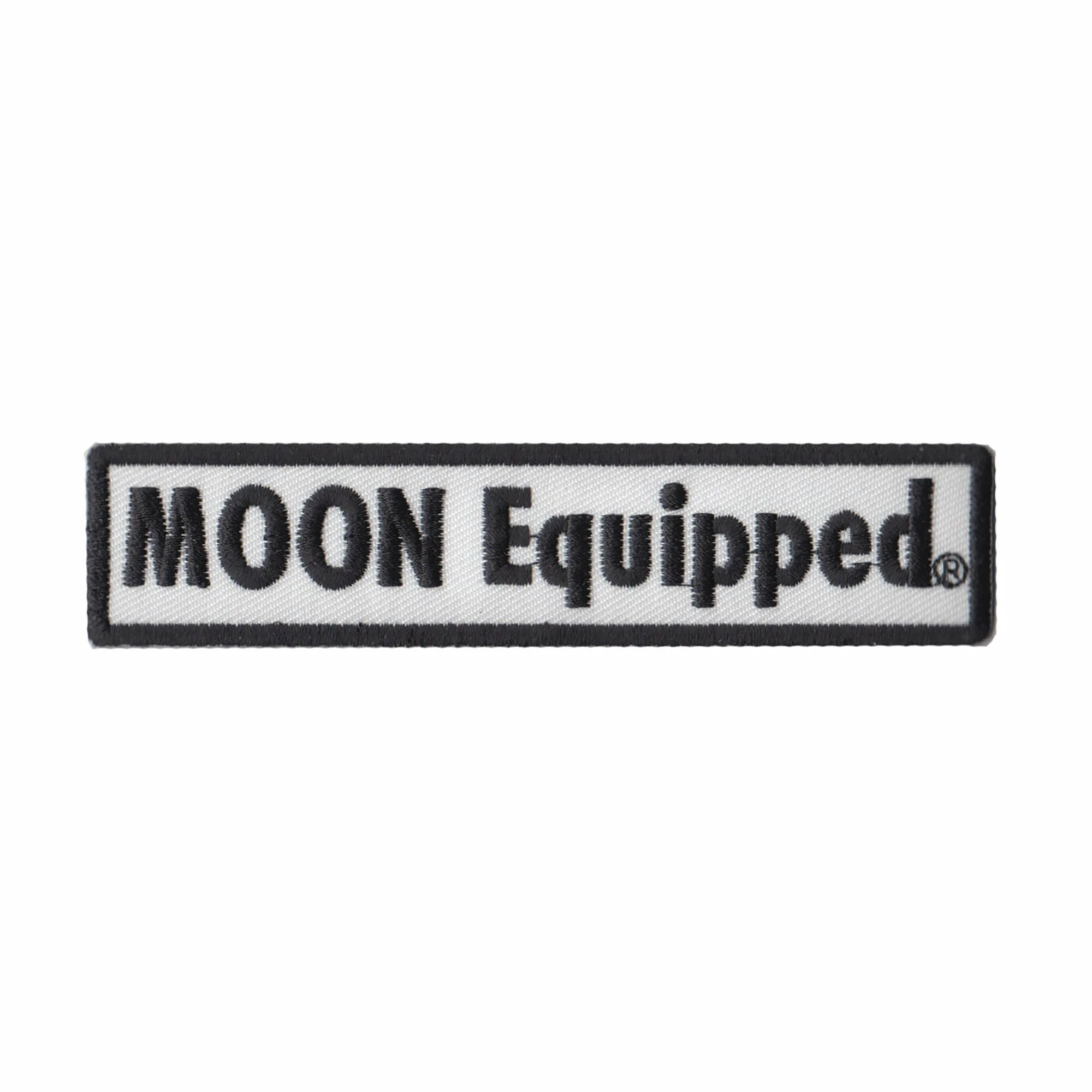 This Moon Equipped patch is rectangular and features only the text logo trademark “MOON Equipped” embroidered in black thread with a black border.