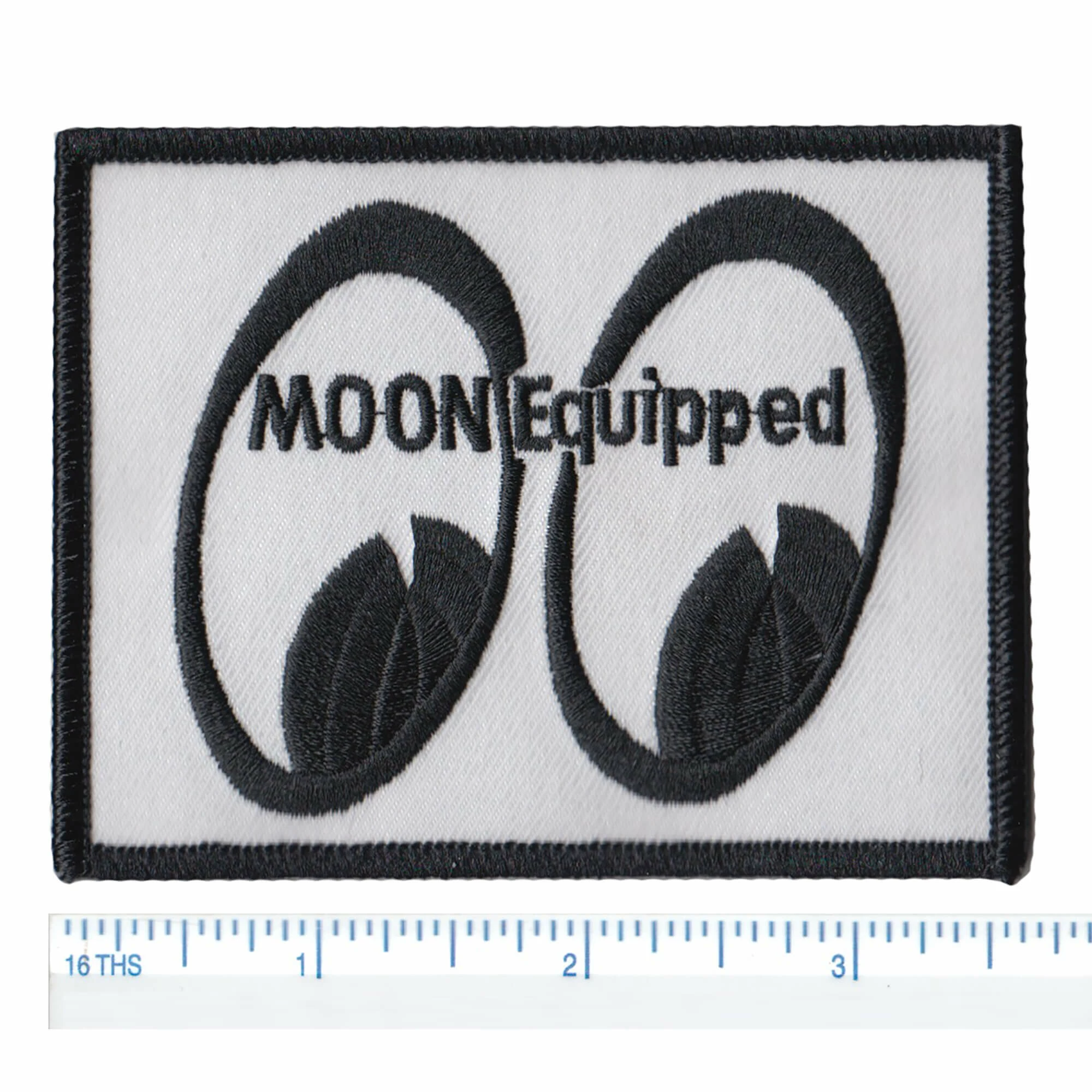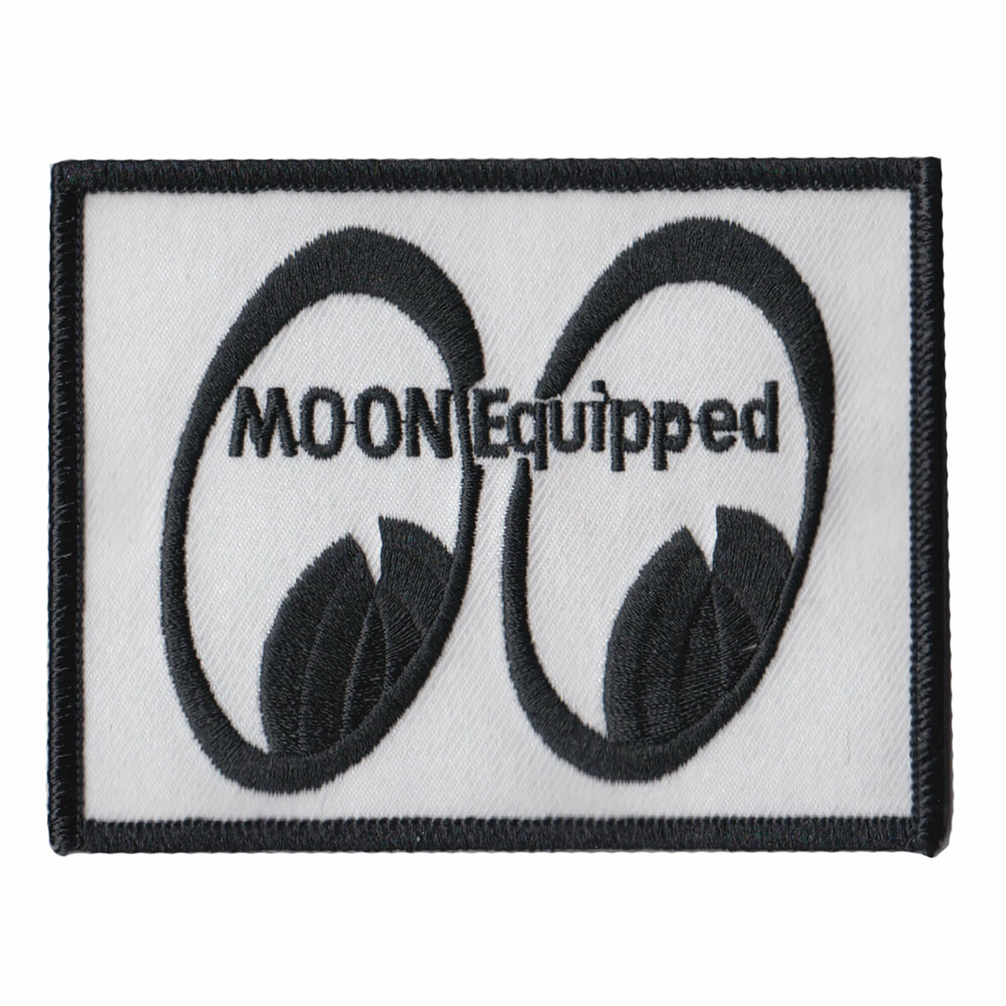 This Moon Equipped patch is square and features the infamous Eyes and the text logo trademark “MOON Equipped” embroidered in black thread with a black border.