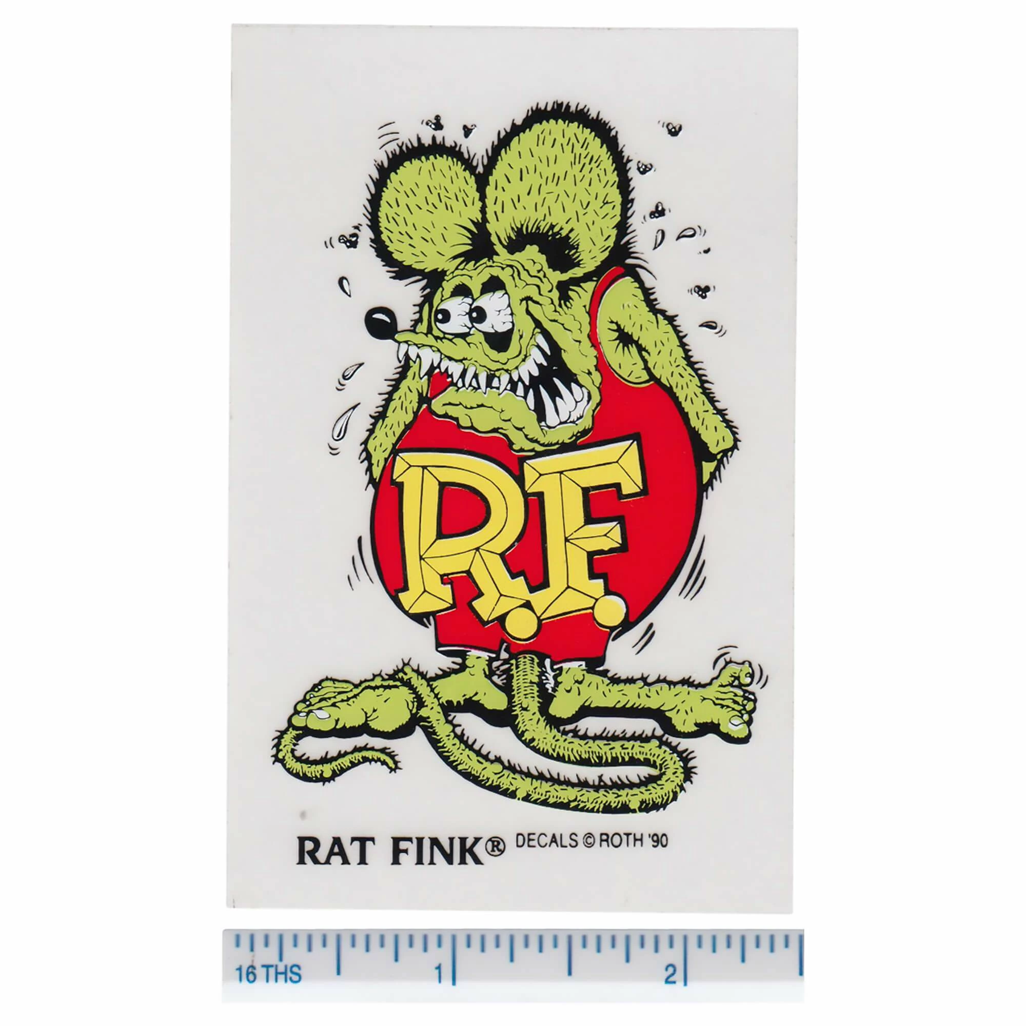 Rat Fink metal flake decal/sticker, as designed by Ed “Big Daddy” Roth back in the day. Color printed on a clear background. Measures approximately: 3-3/4″H x 2-1/2″W.