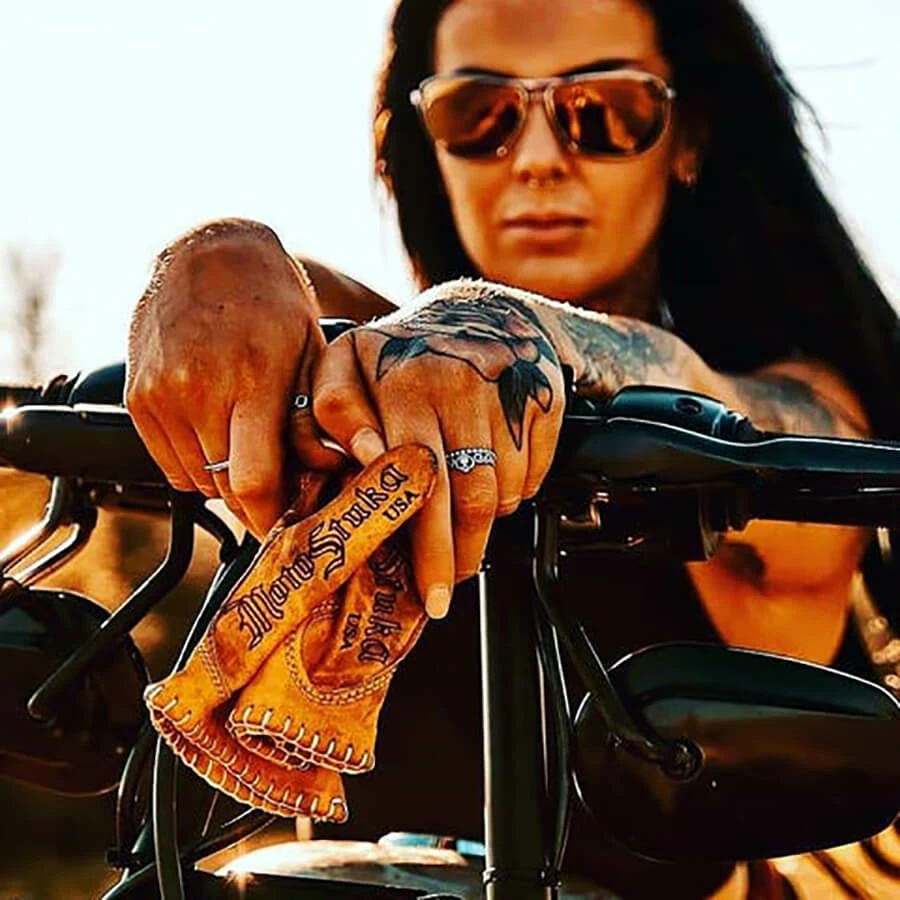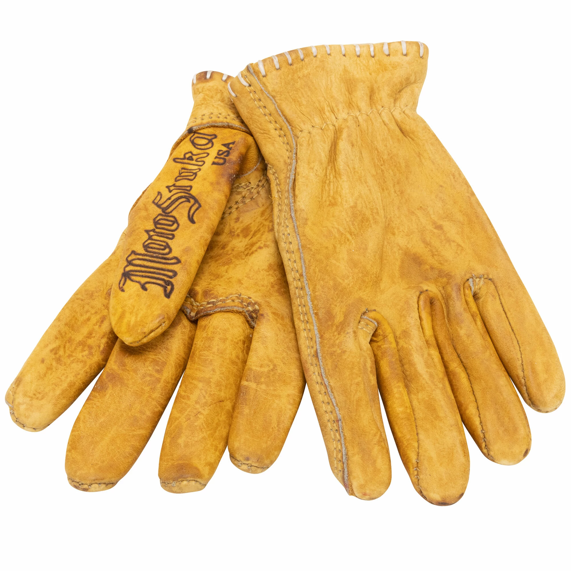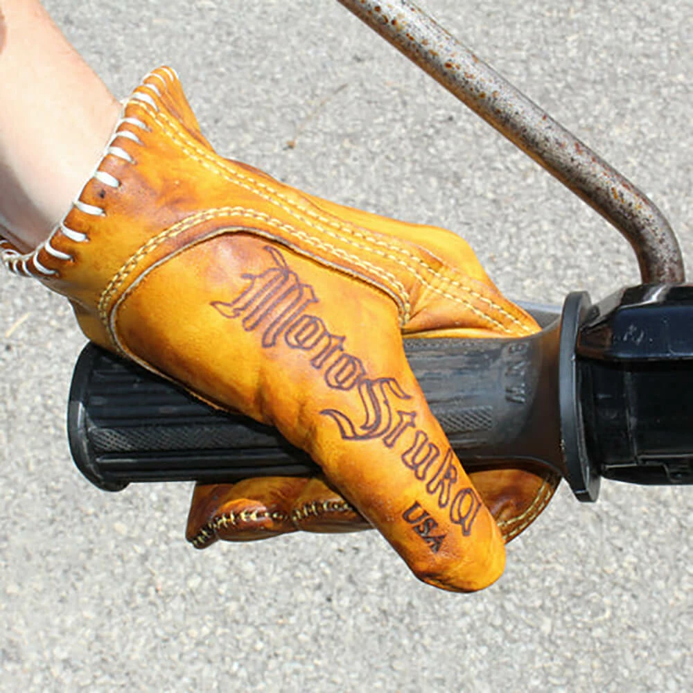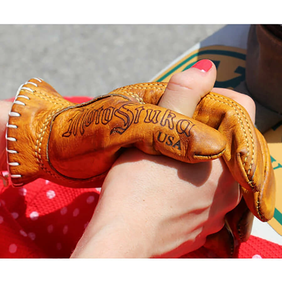 To serve the rapidly growing women’s bike scene, MotoStuka offers HoneyBee Shanks. These are the same high quality, American made gloves as their original Shanks but cut slimmer to fit a woman’s hand. “Shanked” and finished out with waxed thread, they’re conditioned with a balm made of locally sourced natural materials. This finishing process waterproofs the leather and gives it a distressed rich copper finish.