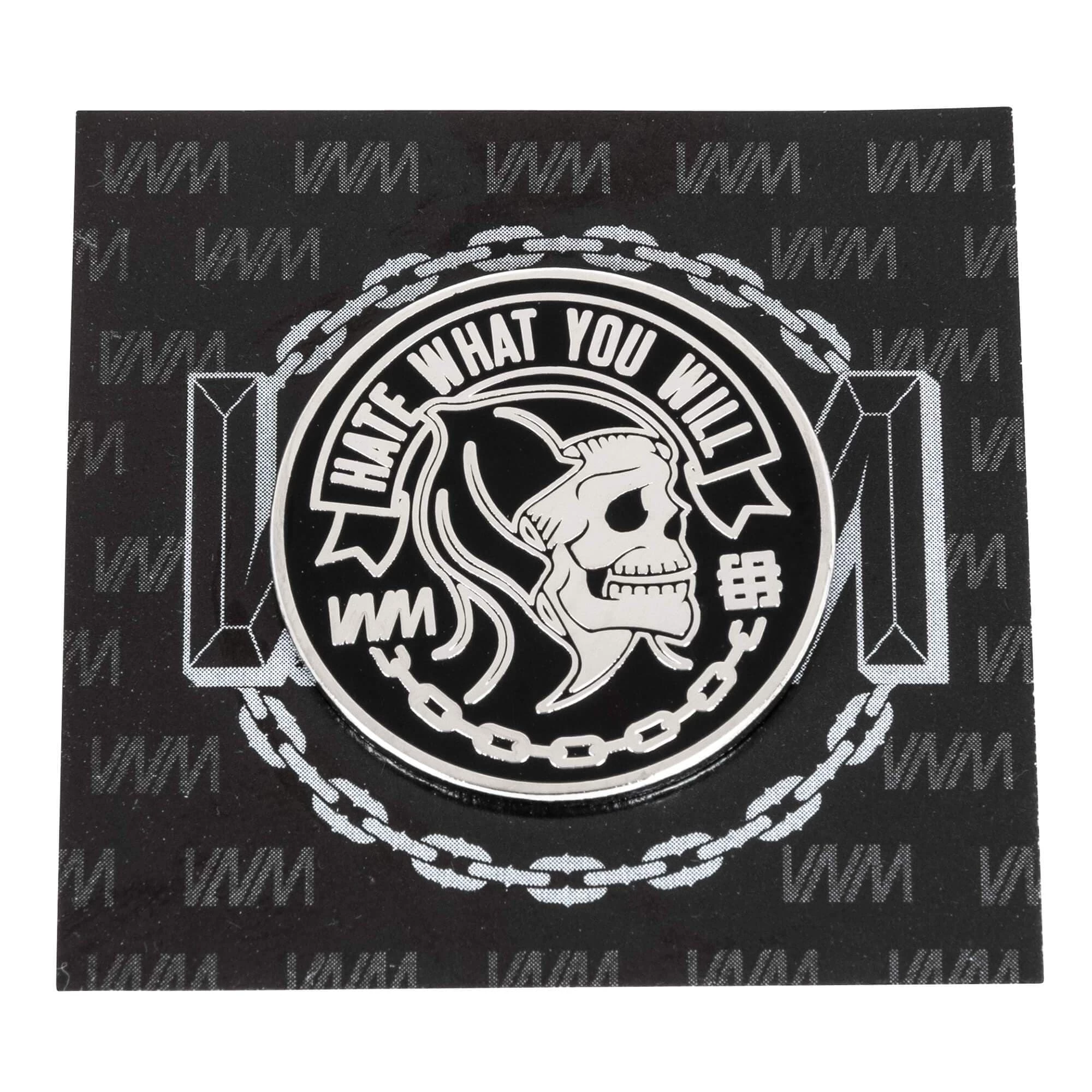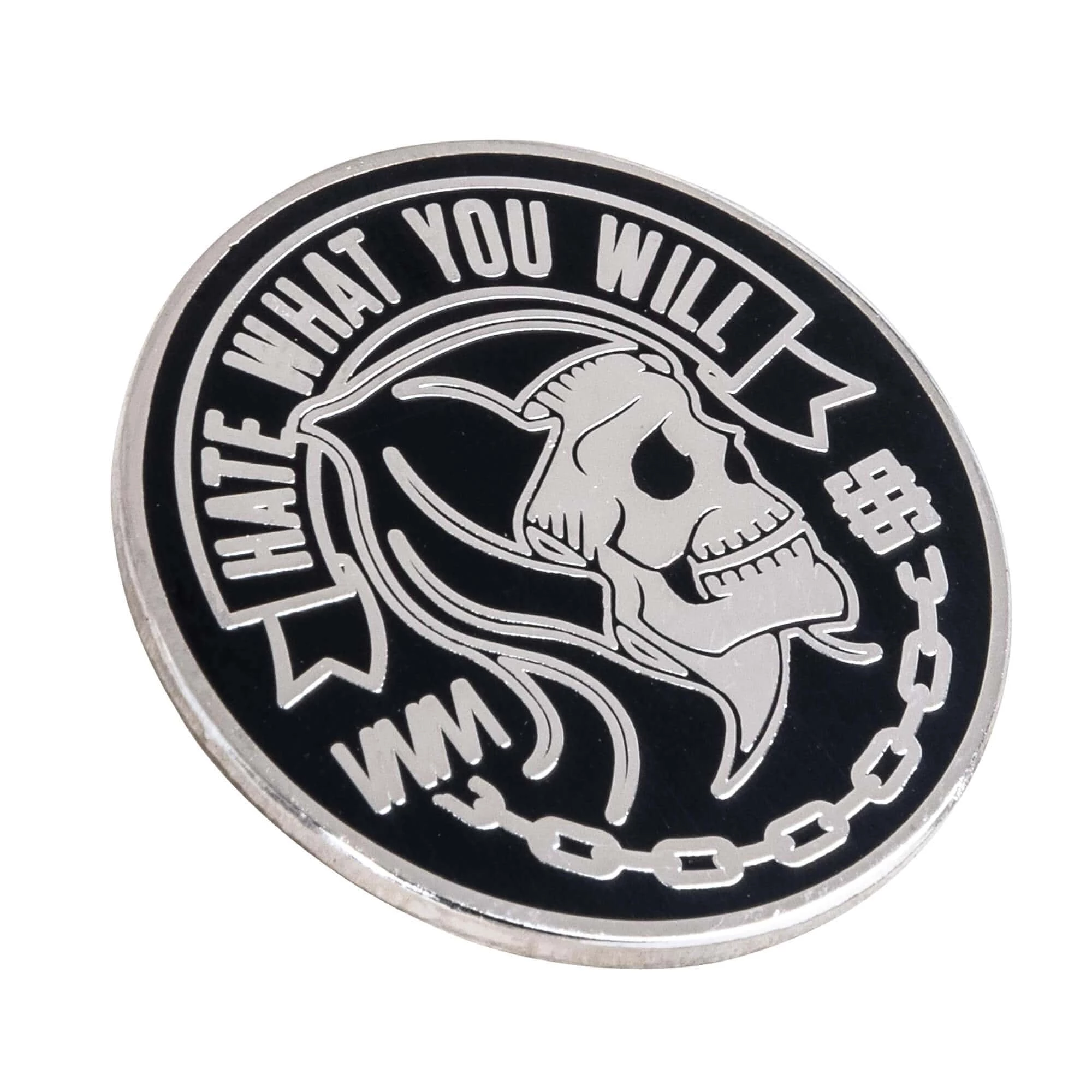 Hate what you will. Die Struck nickel pin with hardened enamel fill. 1″ round.