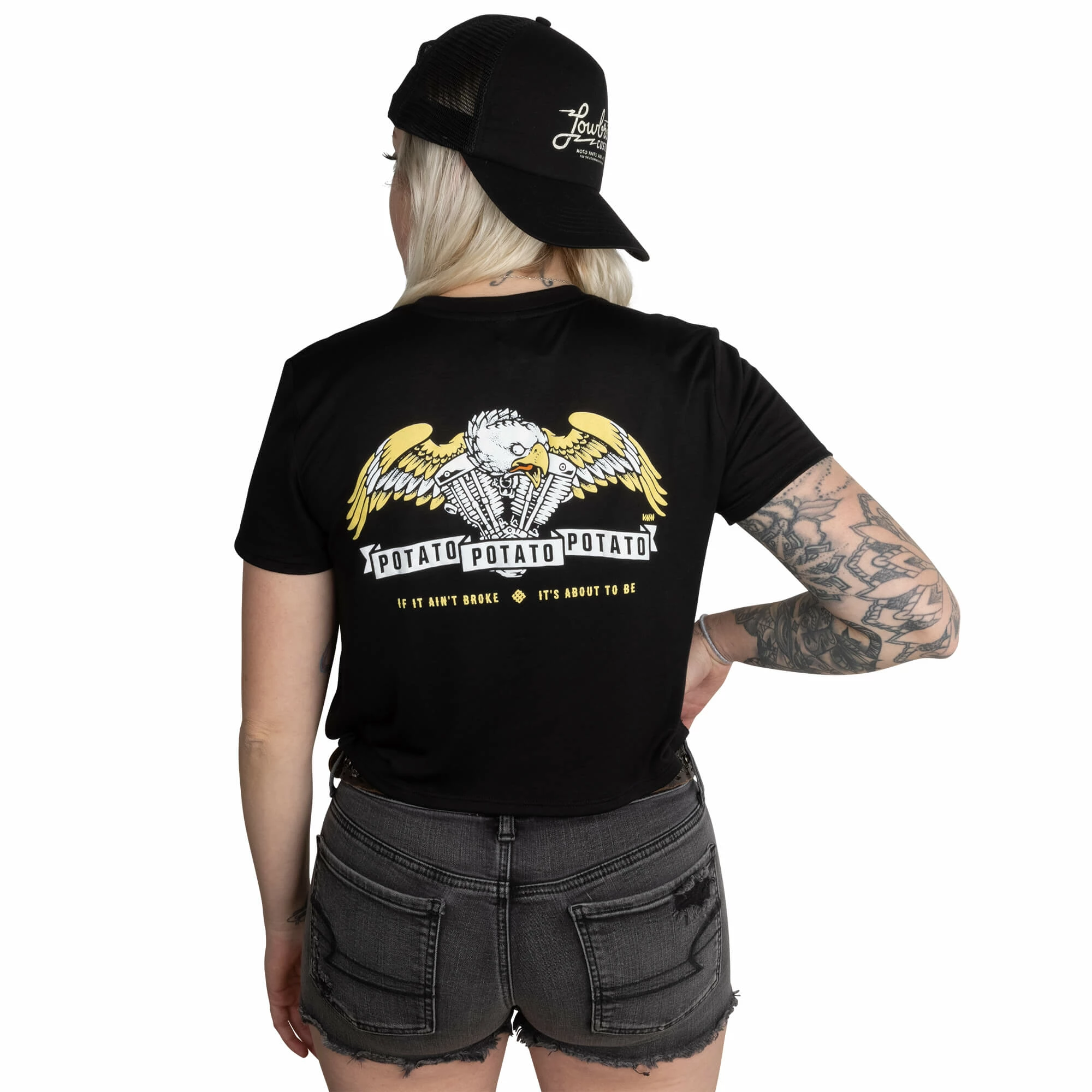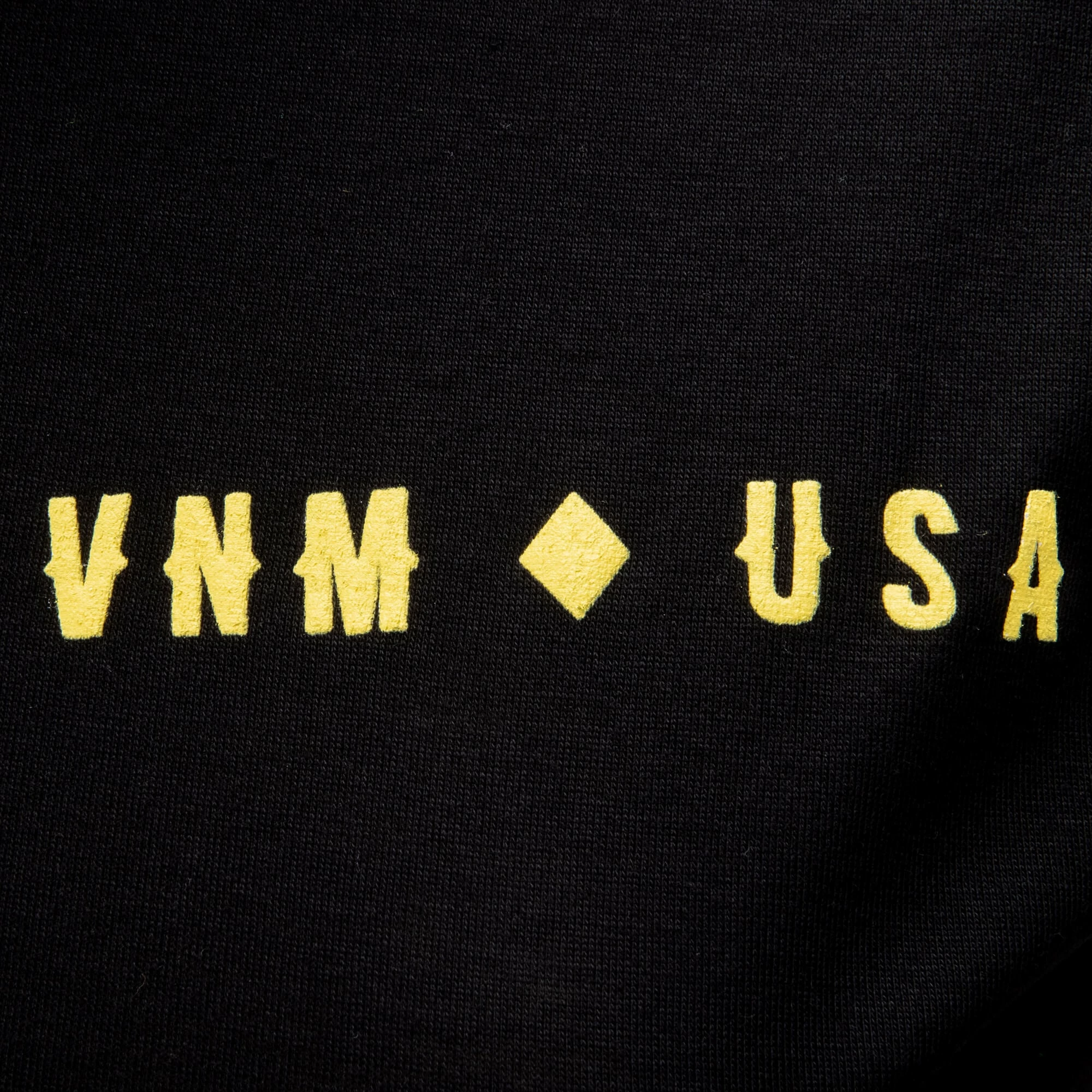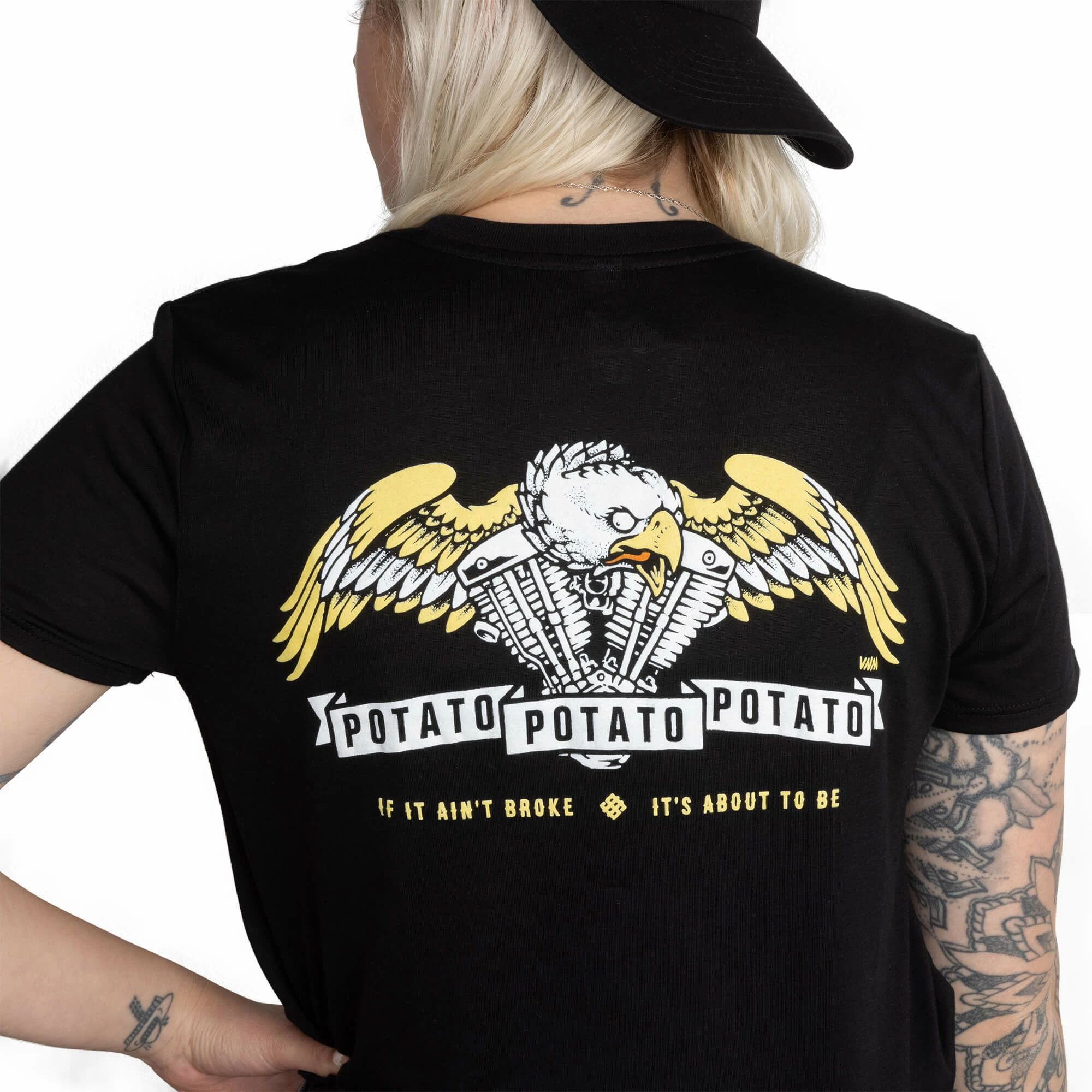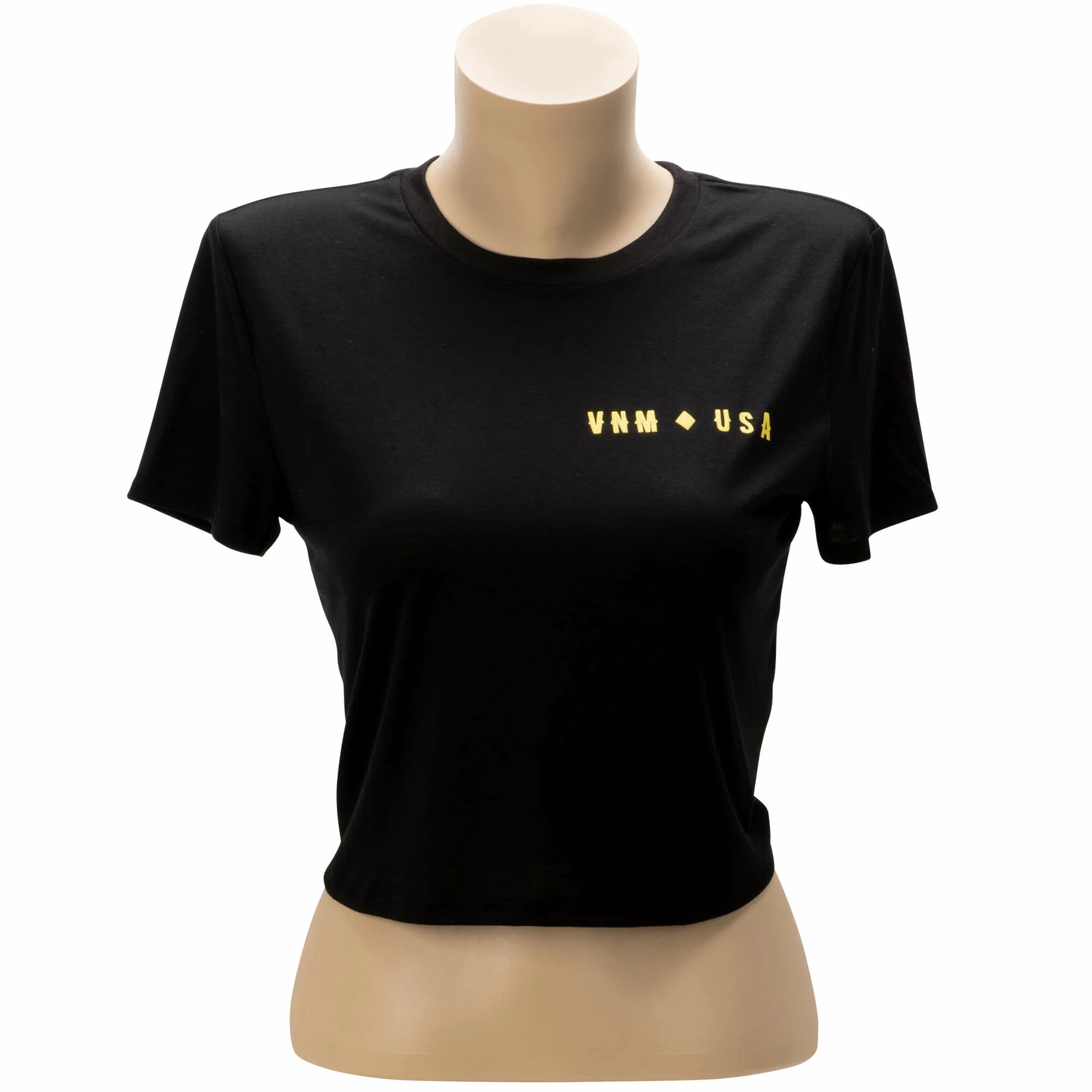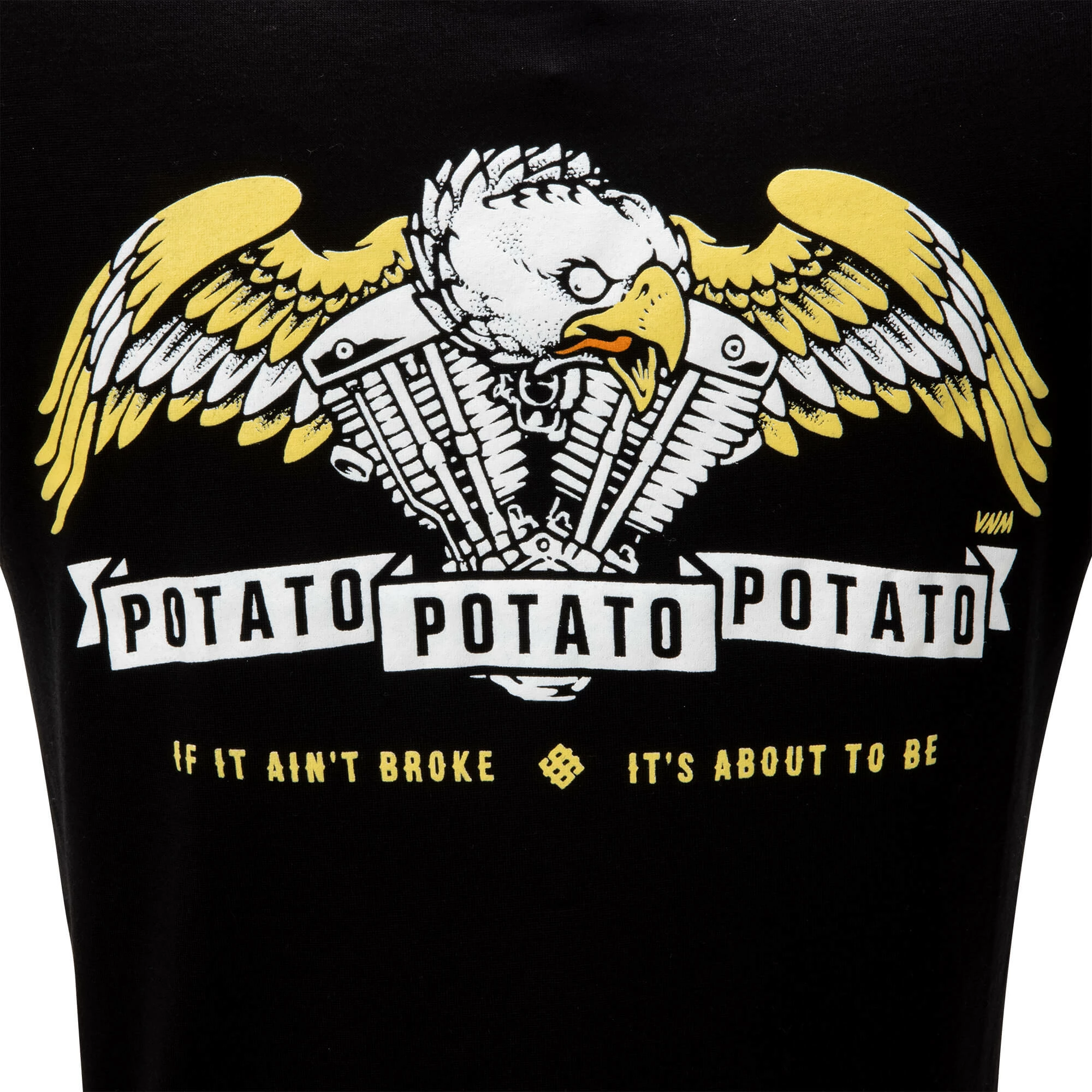 I just wanna do potato stuff with my friends. A VNM classic. Full back imprint, featuring with a front left chest print. Discharge and water based ink on a 100% cotton, black cropped t-shirt.